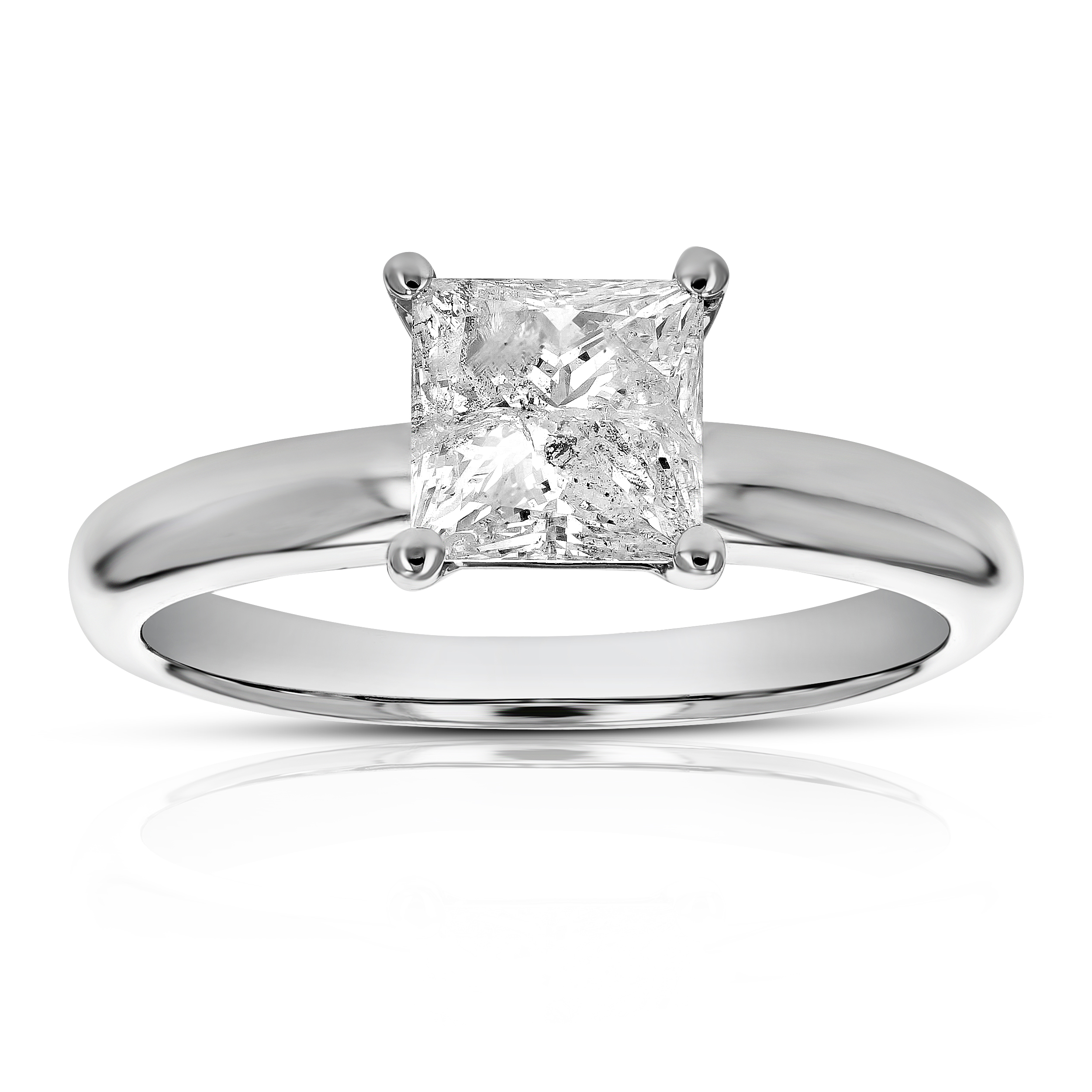 Product Description Lovely, elegant 1.35 cttw diamond solitaire engagement ring in 14k white gold. The sparkling natural princess diamond is I2 clarity, E-F color and set in a prong setting. Width of the ring is 7 mm while the length is 7 mm. Gift box is included with this ring.