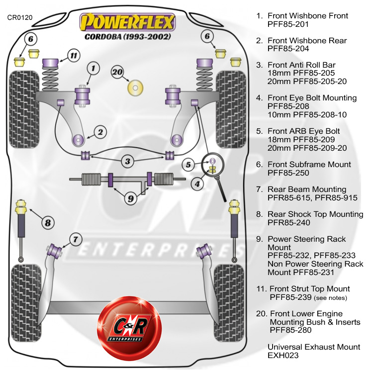 Um die richtigen Powerflex Road- oder Black Series-Buchsen zu identifizieren, die Sie benötigen, sehen Sie sich bitte das Positionsdiagramm weiter unten in der Liste an.
