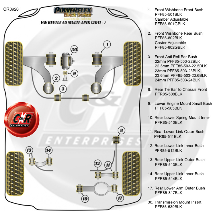 Diese Auflistung gilt für 2 PowerFlex Black Series Front Wishbone Heckbüsche mit der Teilenummer: PFF85-802BLK