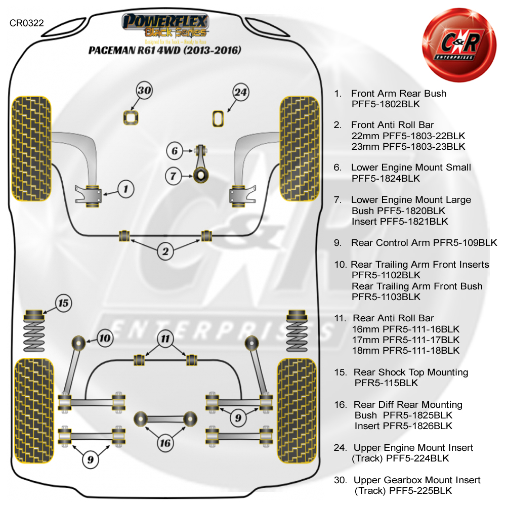Powerflex Serie negra Los productos están enfocados en Track / Motorsport. Para la carretera, use el Púrpura, Amarillo y Rojo Los arbustos PowerFlex son más adecuados para los automóviles modificados estándar y modificados por carretera rápida.