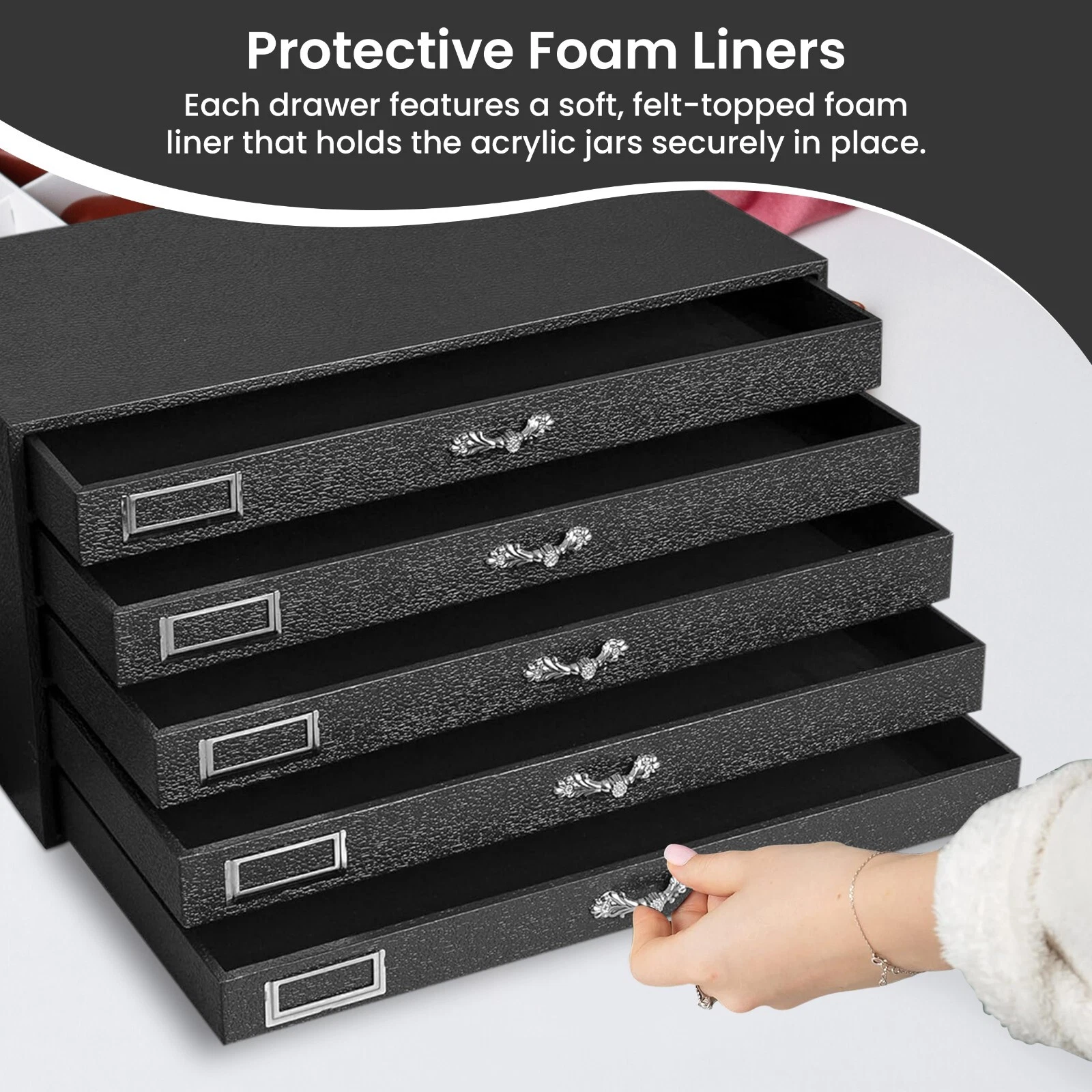 - Versatile for All Collectors: With customizable foam liners and clear acrylic jars, this organizer is perfect for storing various items, from gemstones to small collectibles. The trays ensure each item is visible, easy to retrieve, and safely stored.