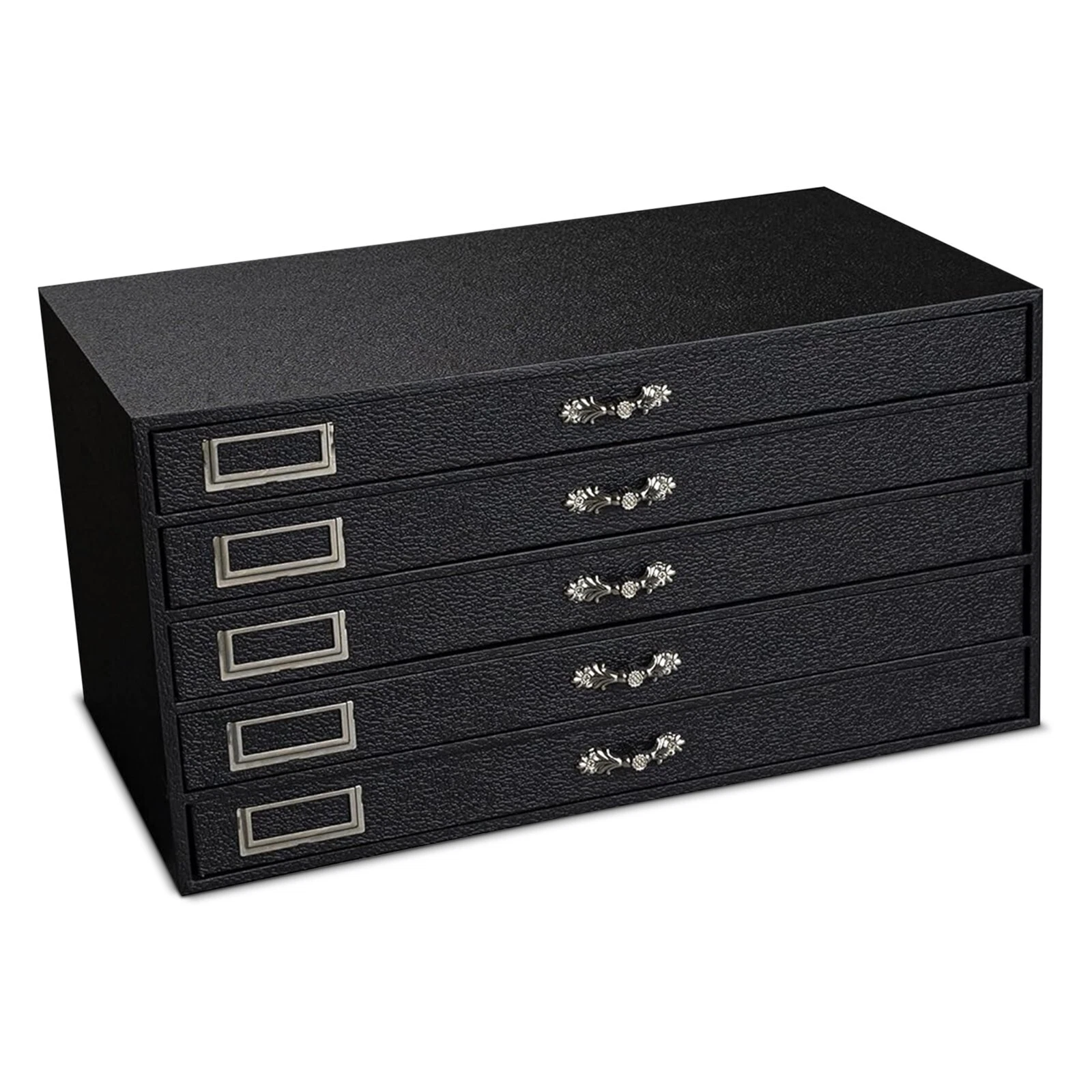 - Complete Set Details: This set includes a stylish 5-drawer jewelry tray organizer crafted from engineered wood with a black leatherette finish. The drawer can be customized with standard-sized foam liners, velvet pads, or flocked velvet jewelry inserts, available separately.