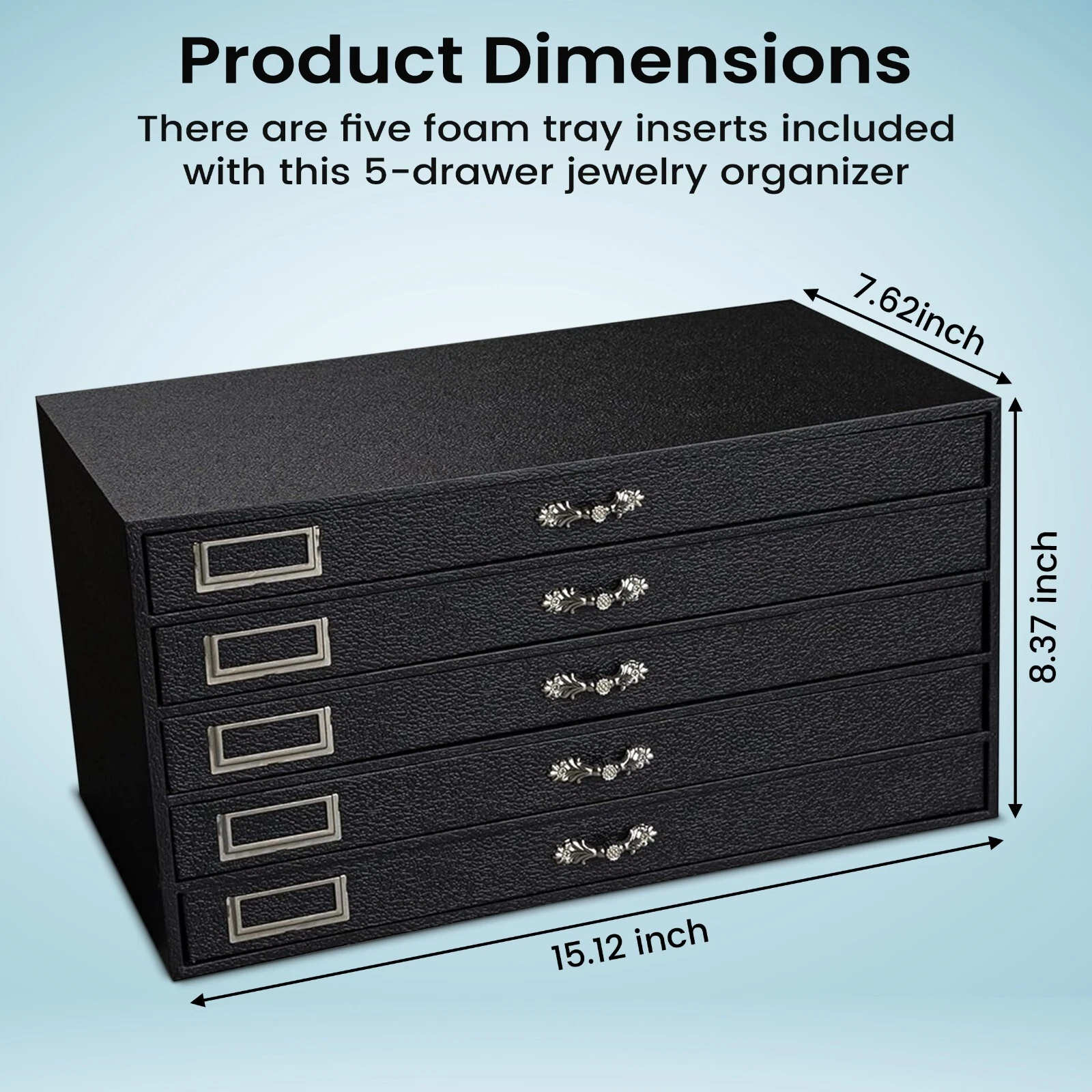 - Size Details: With dimensions of 15.12" X 8.37" X 7.62", this organizer fits easily on most dressers or vanities. It provides plenty of room to keep your jewelry neat and tidy, with five drawers perfect for storing everything in order.