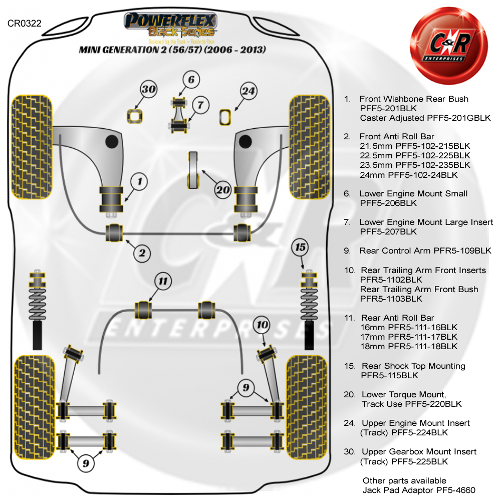 Diese Auflistung gilt für 2 Powerflex Black Heck hinterher-Vorderbüsche mit der Teilenummer: PFR5-1103BLK