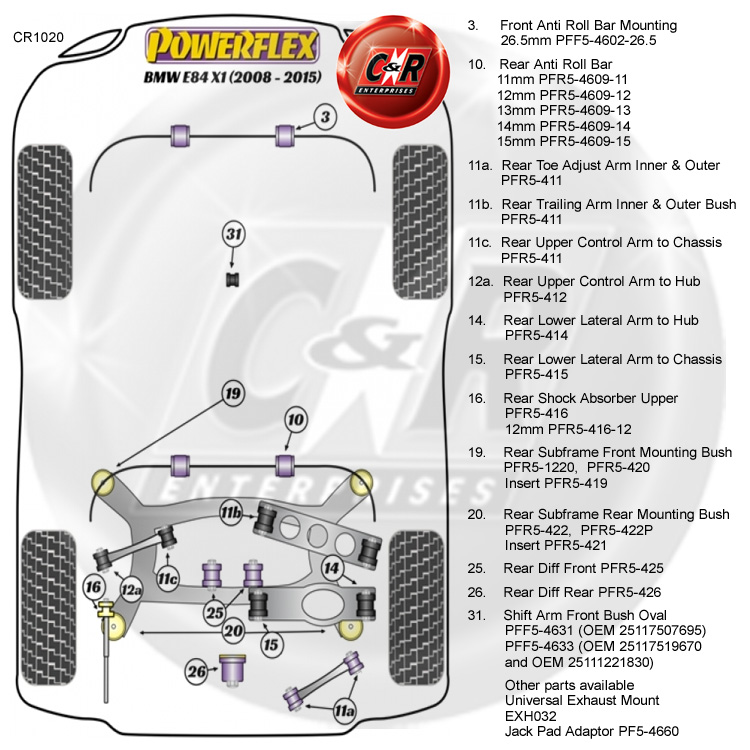 Um die korrekte PowerFlex Road oder Black Series Bush (ES) zu identifizieren, die Sie benötigen, lesen Sie bitte das Standortdiagramm weiter unten in der Liste.