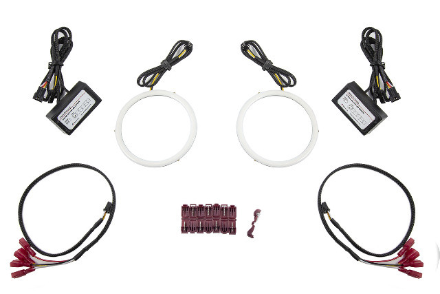 All input wires activate the halos, at different brightness levels. All amber-colored halos ship with low priority drivers. This means that if both low and high power inputs are powered, the LED will light up with low power level. This is convenient for connecting the red wire to a parking light or DRL signal, for use during the day as a high-power DRL. Then, if the white wire is connected to the headlamp power, they will dim down at night. If the yellow wire is powered at any time, the halo will light up at 200 percent brightness momentarily, intended for signalling (dims automatically if powered for more than two seconds).