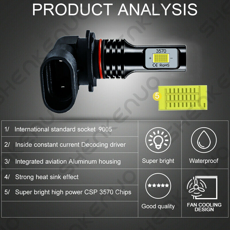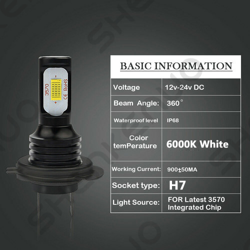 *Latest 3570 CSP chip(USA) light source, 2 luminous faces no blind zone *Engineering beam pattern design throw more light on road evenly at appropriate angle without foggy light *6000K White light reflect road paint/signs better to show clearer road situation during night driving *270 degree low beam angle with cut-off line, will not dazzle oncoming traffic *Built-in constant current CPU, instant full brightness without start-up relay Install Caution: