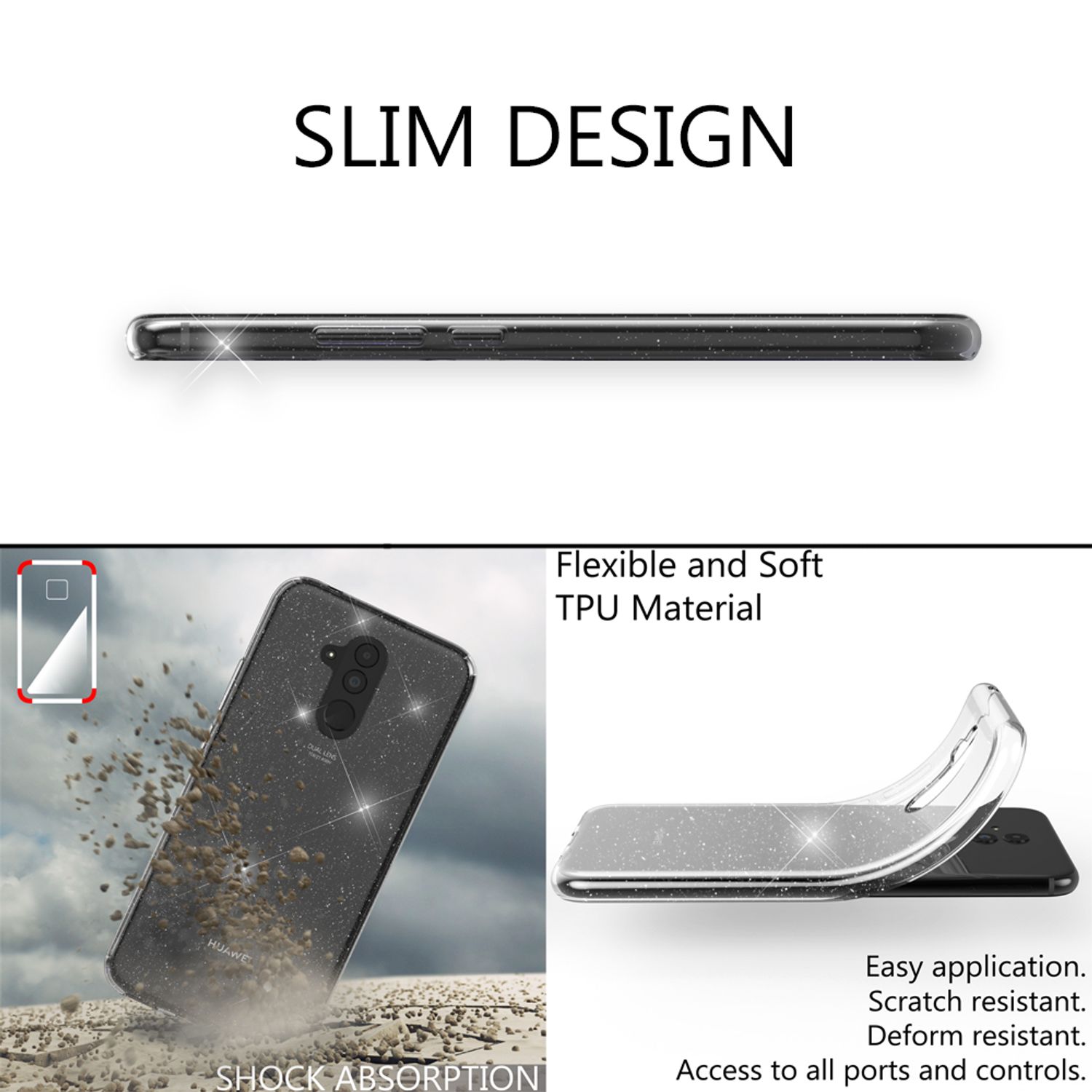 Wunderschönes Case im Glitzer-Design für Ihr Smartphone, in dem Schutz und stylisches Design perfekt miteinander verschmelzen. Die Schutzhülle besteht aus hochwertigem TPU Silikon, dieses Material weist eine hohe Haltbarkeit und Formbeständigkeit auf. Dank des Materials liegt Ihr Handy nicht nur sehr gut und rutschfest in der Hand, sondern es erleichtert auch das Anbringen sowie das Entfernen des Cases. Die dünne Silikonhülle ist sehr hochwertig verarbeitet und perfekt auf Ihr Smartphone zugeschnitten, dies gewährleistet einen sicheren Halt und Schutz. Der Rahmen des Cases ragt etwas über das Display hinaus, wodurch dieses nicht auf Oberflächen aufliegt. Das hält Ihr Display sauber und kratzfrei. Alle Knöpfe und Anschlüsse sind nach dem Befestigen weiterhin problemlos bedienbar.