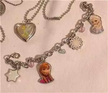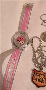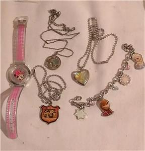 5 pieces of Disney Jewelry including a Minnie Mouse watch for a little girl. I also have tinkerbell hologram heart locket on ball chain Frozen bracelet, high school musical shield shaped pendant on ball chain and a Little Mermaid pendant in silver tone metal on a chain. The little mermaid pendant is on a more fashion jewelry style chain and is missing some color but still has a nice look. Notice the tiny seashell on the rim! I would just remove the color (fingernail polish remover might take it off) and let the silver tone shine through. These pieces are appropriate for children and all are marked Disney. Great opportunity for a dealer to put more Disney pieces in their inventory.