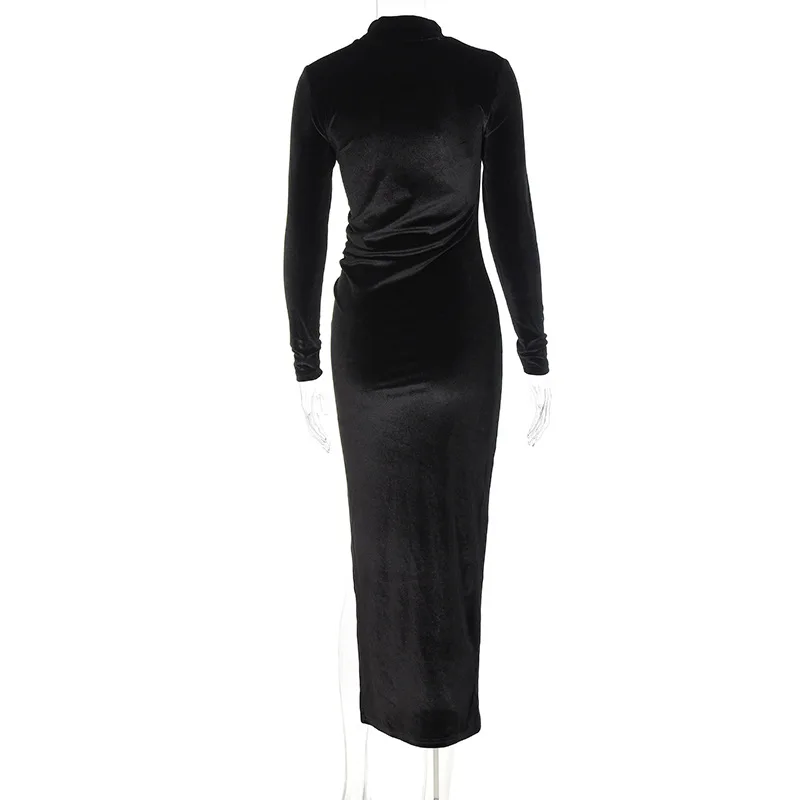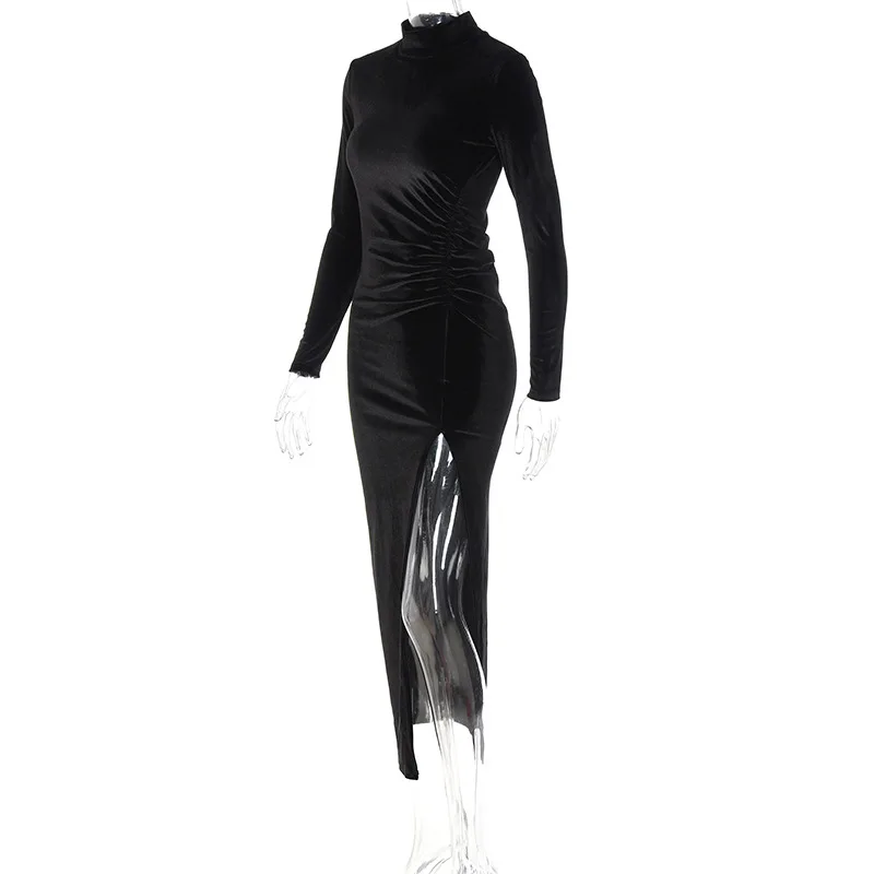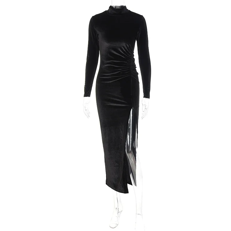 Women Solid Velvet Long Sleeve Ruched Side Slit Bodycon Sexy Party Midi Dresses