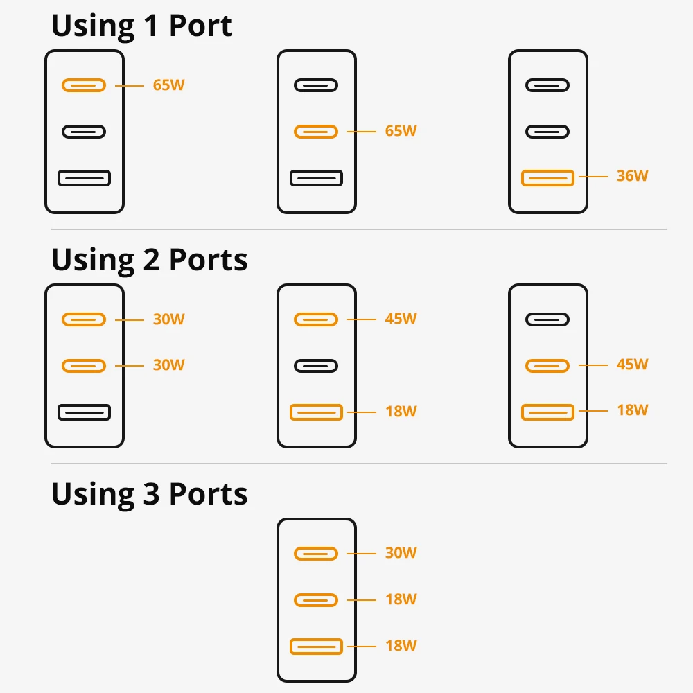2 x USB-C Power Delivery 3.0 (Max 65W)1 x USB-A Quick Charge 3.0 (Max 36W)