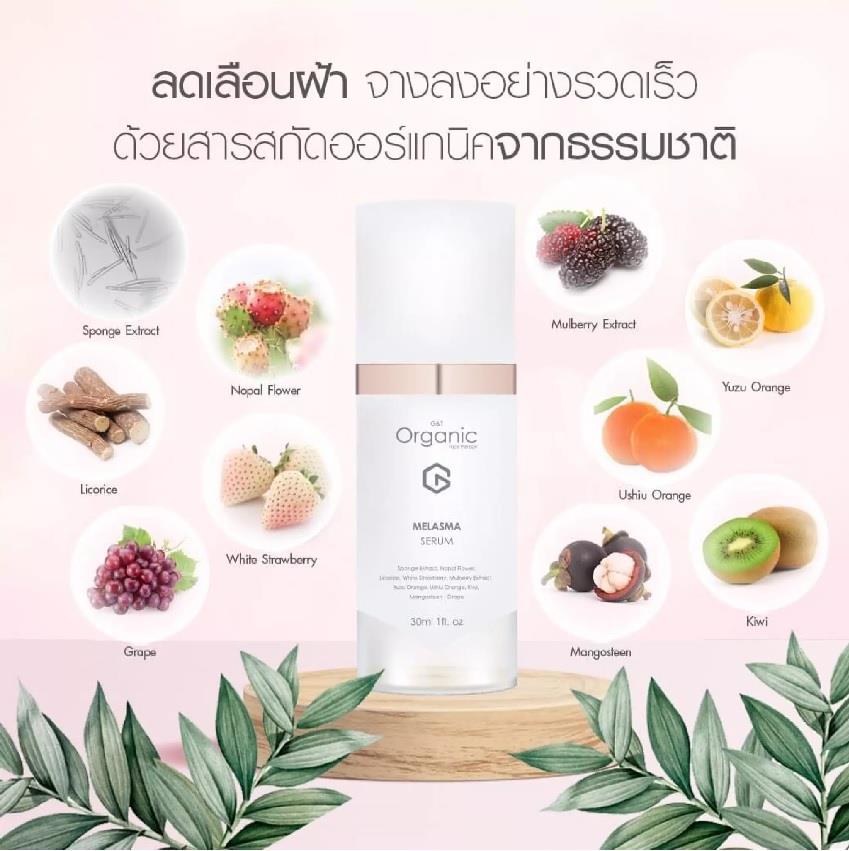 G&T Organic Melasma serum is the nourishing facial serum with organic plants formula that contains the ingredient more than 10 types from natural extracts (Kiwi, Strawberry, Grape, Mangosteen, Mulberry, Pricky Pear, Argan Oil, Chamomile, Rosemary, Gotu Kola, Japanese Knotweed, Baikal Skullcap, Green Tea, Licorice, Yuzu Orange and Citrus Unshiu) for solve the melasma, freckles and dark spots and dullness problems on facial skin.