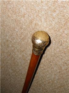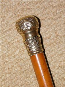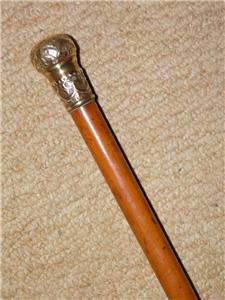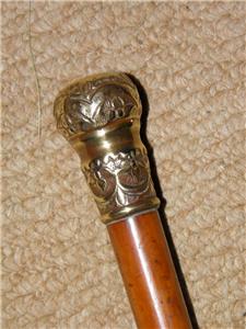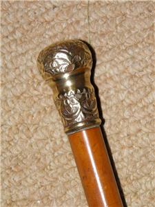 This cane has a Gold plate pommel top that has a floral repousse pattern.