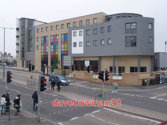PHOTO BOURNEMOUTH: DORCHESTER HOUSE ONE OF THE MOST DISTINCTIVE NEW BUILDINGS IN THE TOWN DORCHESTER HOUSE IS A BLOCK OF STUDENT ACCOMMODATION FOR BOURNEMOUTH UNIVERSITY. THE 540-ROOM BLOCK WAS OPENED FOR THE 2012-13 ACADEMIC YEAR. LIKE MOST OF THE UNI BUILDINGS IT IS NAMED AFTER LOCAL TOWNS AND VILLAGES - OTHERS FOR EXAMPLE ARE LYME REGIS HOUSE STUDLAND HOUSE AND HURN HOUSE.DORCHESTER HOUSE IS BUILT ON THE SITE OF THE FORMER B&Q SUPERSTORE WHICH TOOK ON A NEW LIFE AFTER THE DIY CHAIN VACATED IT AS THE HOME OF A CHURCH. IT WAS DEMOLISHED IN DECEMBER 2008 FOR A COMPARABLE VIEW TAKEN FROM THE SAME SPOT; TODAY'S VIEW IS SLIGHTLY WIDER BECAUSE THE NEW BUILDING TAKES UP A LOT OF THE B&Q FRONT CAR PARK). 2013 COPYRIGHT (Photograph and text in Extra Info) CHRIS DOWNERPHOTO PAPER THICKNESS NORMAL PHOTOGRAPH THICKNESS