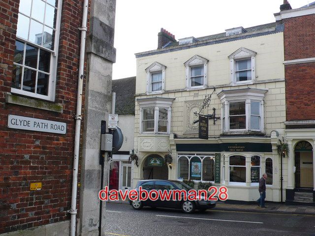 PHOTO ROYAL OAK DORCHESTER THE PUB IS ON HIGH WEST ST OPPOSITE THE SHIRE HALL WHICH CAN BE SEEN ON THE LEFT. TAKEN FROM GLYDE PATH ROAD THE OLD NAME OF WHICH WAS SHIRE HALL LANE. THIS OLD NAME CAN BE SEEN FAINTLY HIGHER UP ON THE CORNER OF THE BUILDING. THOMAS HARDY ONCE LIVED IN SHIRE HALL LANE. 2008 COPYRIGHT (Photograph and text in Extra Info) NIGEL MYKURAPHOTO PAPER THICKNESS NORMAL PHOTOGRAPH THICKNESS