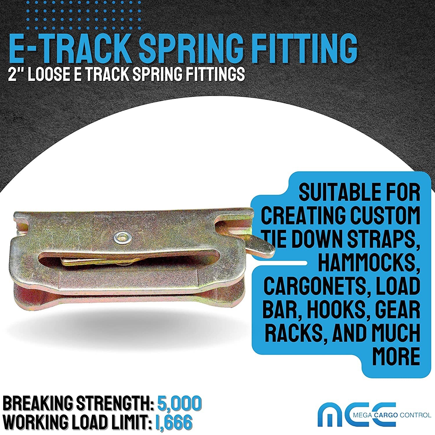The Mega Cargo Control E Track Spring Fitting can be used as a replacement for damaged E-Track fitting on straps and for customer Assemblies.Can Be used for: Vacation: Tie down Tarp, Vehicles, Events, Hammocks Outdoor Sports: ATV, UTV/SXX, Quad, PWC, Jet SKI Moving: Furniture, Bed Frames, Dresser Sets, Storage