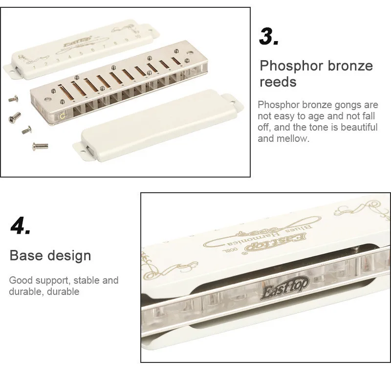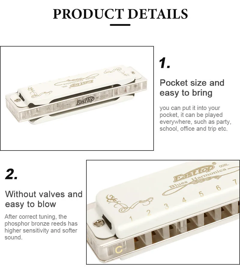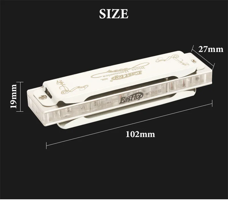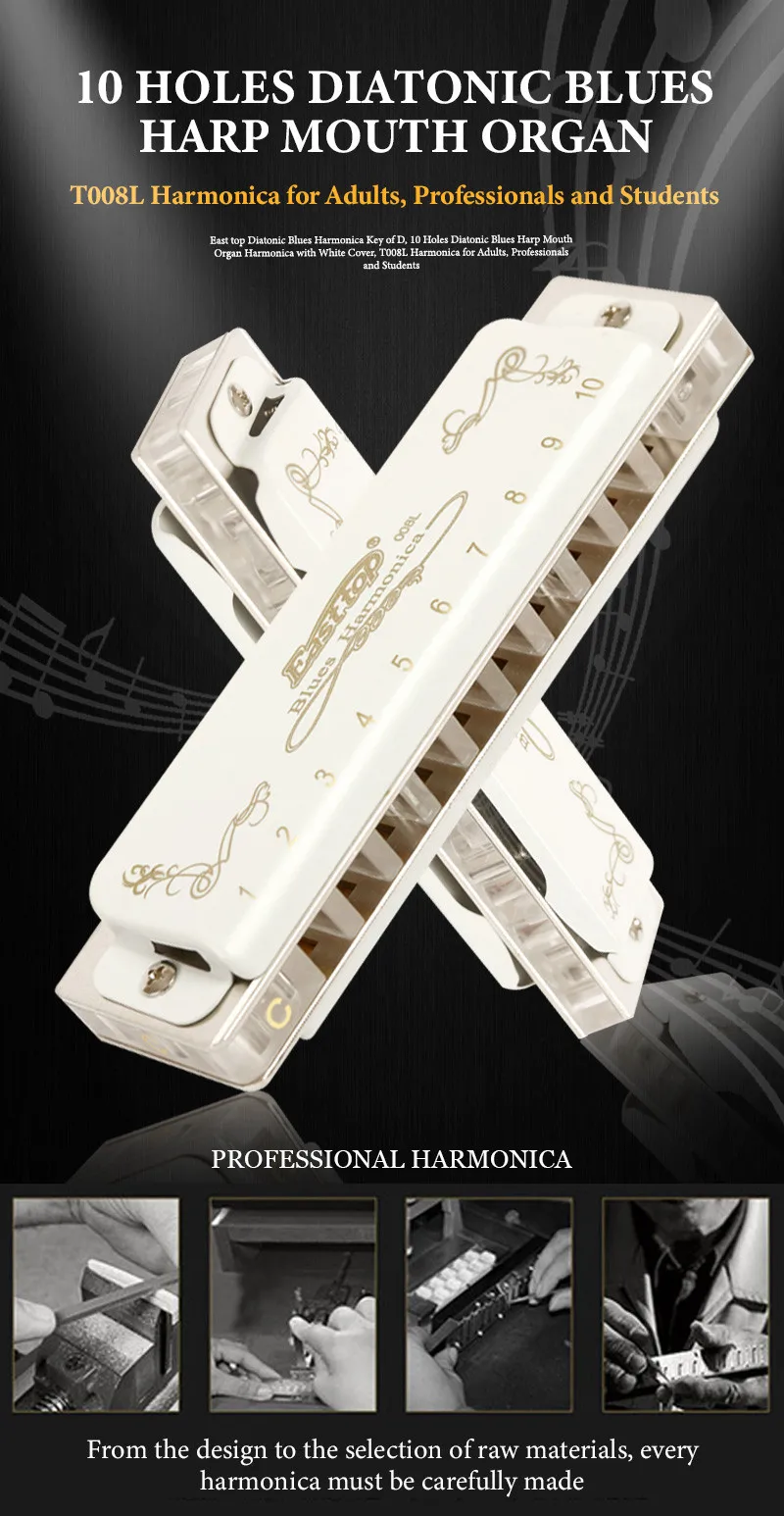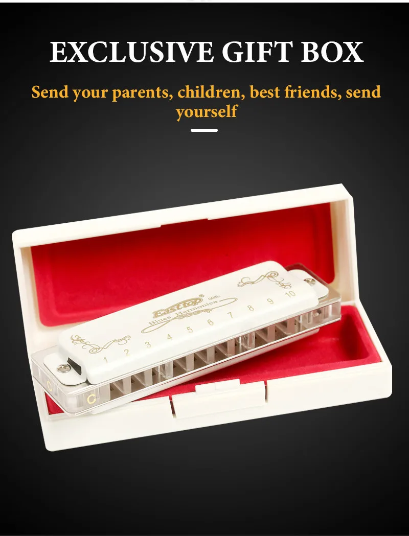 Professional harmonica for adult-East top 10 hole professional diatonic harmonica, suitable for Blues, Folk, Rock, Country, Jazz etc. Great for professional harmonica players and beginners. This Professional Blues Harmonica has exquisite workmanship, beautiful appearance, accurate tone and responsive. Rich sound,responsive,airtightness - the precision-phosphor bronze reeds,brass reedplate(1.2mm thickness) with electroplate,brass cover with white paint,Acrylic comb. At the same time,you will feel comfortable when playing,easy to use the skill,such as over-blowing and bending, giving the performer a new experience. Pocket size and easy to bring(102x 27 x 19)mm(L x W x H), you can put it into your pocket, it can be played everywhere, such as party, school, office and trip etc. Beautiful packaging- The package is exquisitely small and can be used as a birthday present, a gift for further study, a holiday souvenir or a business meeting gift and wedding anniversary etc. Package includes 1x harmonica; 1x instruction and 1x cleaning cloth. We are the harmonica manufacturer of the East top brand.Backed Up with East top 30 Days Unconditional Money Back . You can rest assured to buy our products.