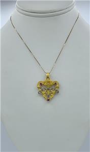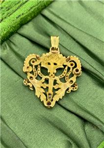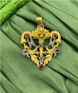 The gorgeous heart shape pendant has all the elements of the French Napoleon III jewels that we love, the exquisite craftsmanship, spectacular design, ornate elegance and beautiful gems. This pendant is one of my favorites. The open work pendant has a flower, leaf and scroll motif in a heart shaped design. The top of the heart is a flower bouquet with rose, daisy and poppy flowers. The flower form continues with buds and leaves forming the sides and bottom of the heart. The jewel is 18 Karat Yellow Gold.