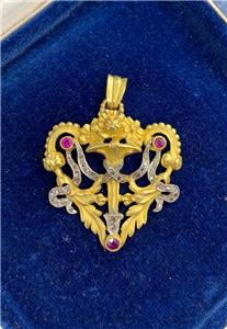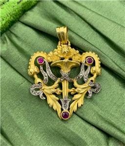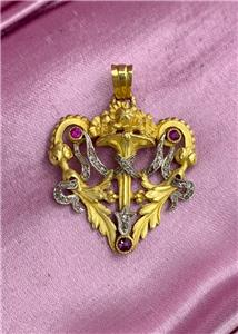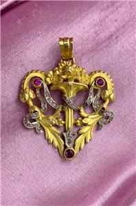The jewel has wonderful craftsmanship and the gorgeous color of the French 18 Karat Gold. The heart motif is a romantic elegant expression of love and devotion. The pendant dates to the Victorian - Belle Epoque period, circa 1850-1890.