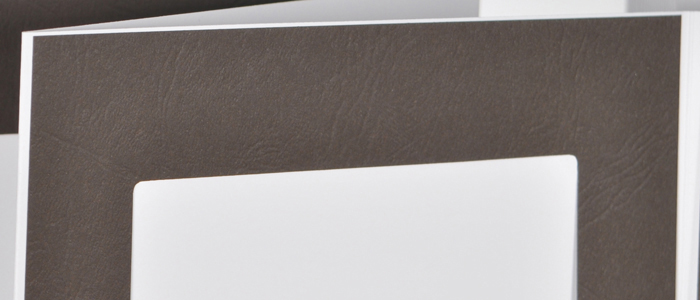 13 x 18 Foto´s, geklebt. Brauner Karton auf weißem Trägerkarton. Die Passepartouts haben eine sehr schöne Lederstruktur. Alle Passepartouts rechteckig.