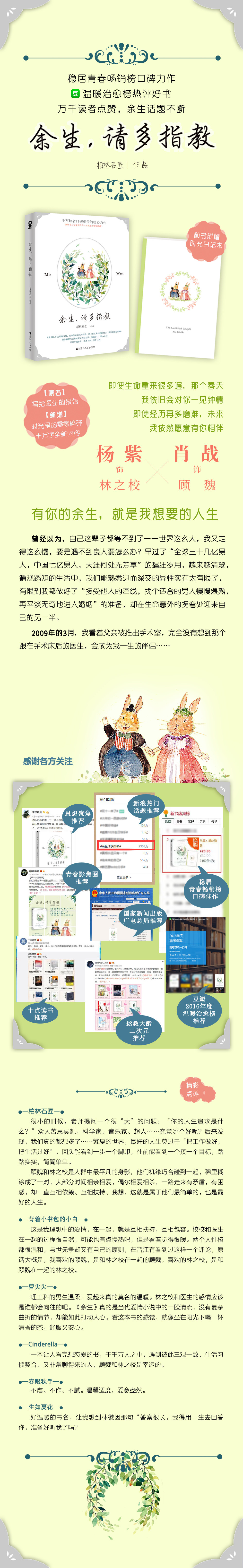 没有跌宕起伏的剧情,没有华丽的背景,有的只是平淡生活中的相濡以沫,这是一本让人看了想要去恋爱的书,很高兴,看到了校校和顾医生的故事,温暖又治愈。