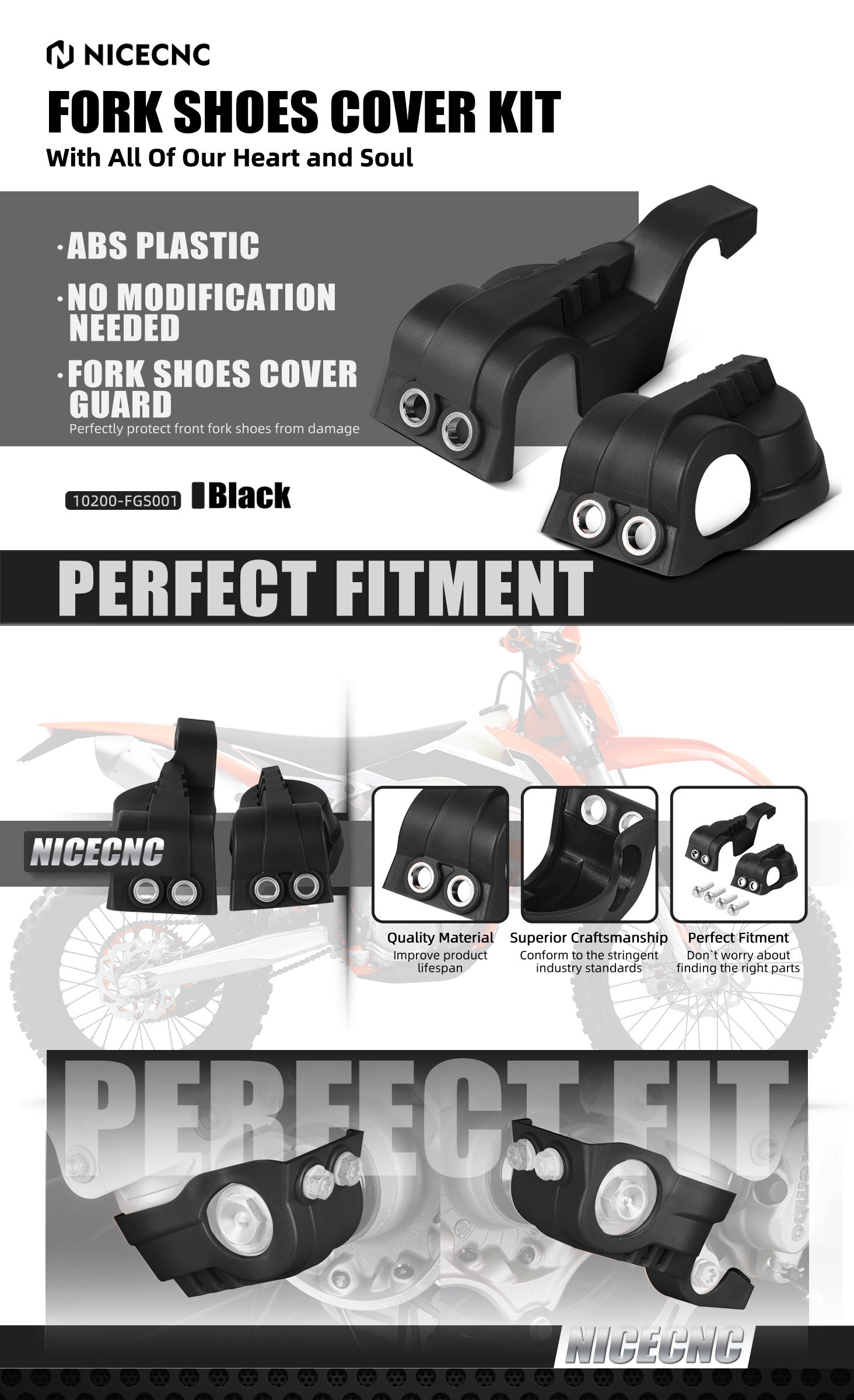 -- Condition: 100% Brand New -- Material: ABS Plastic -- Color: Black -- High Class Quality and Very Durable -- Perfectly protect front fork shoes from damage. -- No Modification Needed Package Including: 1 Pair x Fork Shoe Protection Kit Fitment: