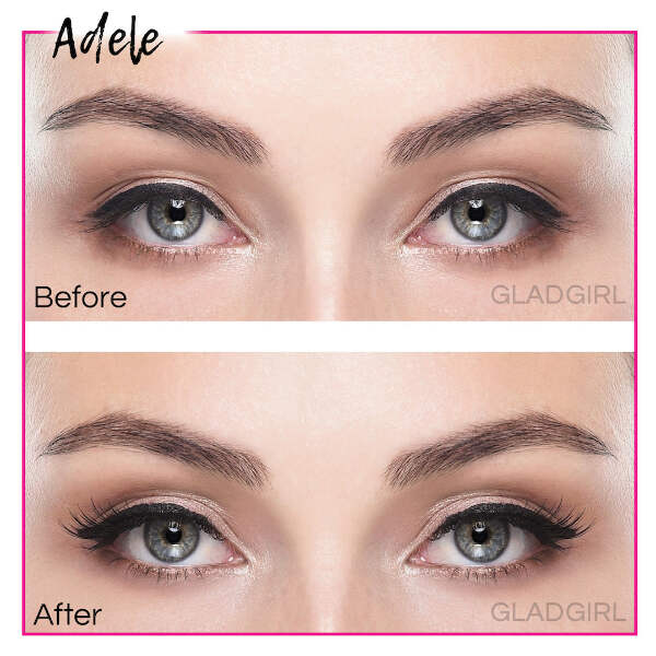 Alternating groups of short and long lashes, create a spikey, bright look for the eye. Made on a clear band, the long Adele outer lashes are 13 and 14mm (B Curl) while the shorter inner corner lashes are 8 and 9mm (J Curl). Enjoy this Glad Lash® favorite now!