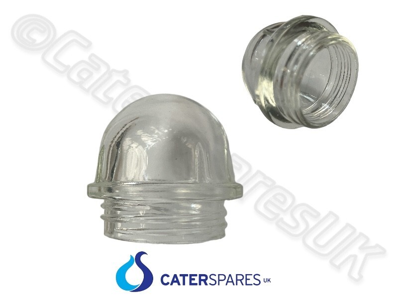 Esta lente de vidrio se encuentra en varios electrodomésticos y mide aproximadamente 73 mm de diámetro máximo x 65 mm de diámetro en el extremo roscado x 44 mm de profundidad.
