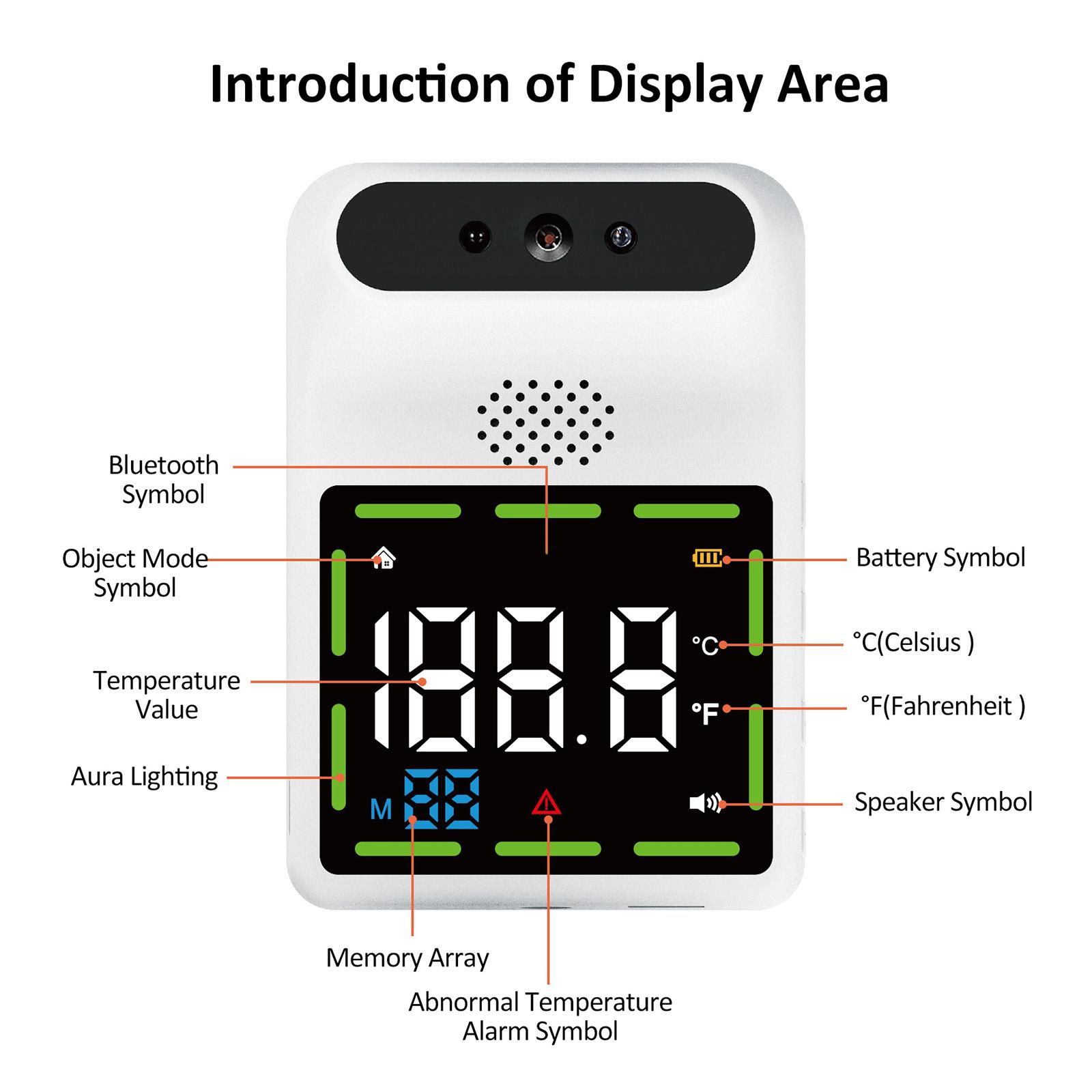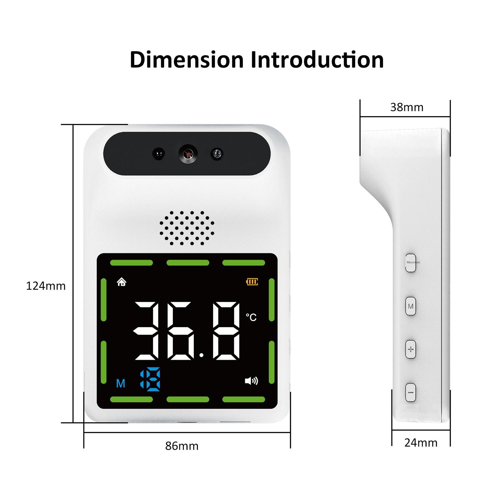 Description: Convenient and fast temperature measurement in 0.1 seconds when up to 15cm away from the thermometer, with the accuracy tolerance being ±0.2°C. Convenient- Wall-mounted thermometers is smart and convenient and avoid the possibility of cross- via hand-held body temperature meassurement. It can switch between Fahrenheit and Celsius measurement with one click, which is very convenient. Can be applied in different occasions. Office/ Subway/ Family/ Superstore/ Shop/ Community/ Entrance etc. Noncontact infrared technology reads from forehead, prevents cross- between multiple people, fast and accurate temperature measurement. Specification: Maximum error: ±0.2°C Measurement environment: 0°C~42°C Measuring distance: 5cm~15cm Power supply: 3 AA batteries (Not Included) / Type-C (DC 5V 1A) Size: 124x86x38mm / 4.88x3.38x1.49inch Package Includes: 1 Piece Wall Mounted Thermometer 1 Piece USB Cable 1 Piece Manual 1 Pack Mounting Nail Note: Please allow 1-3mm measuring deviation due to manual measurement. Due to the different monitor and light effect,the actual color of the item might be slightly different from the color showed on the pictures.Thank you!