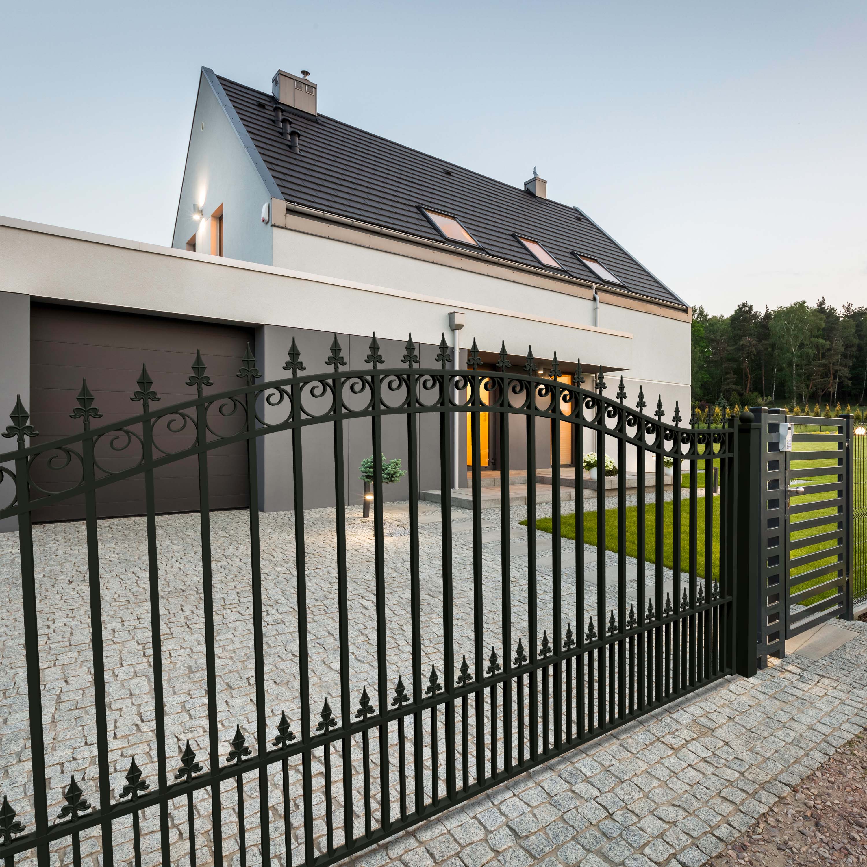 Prague Style Driveway Gates, Prague Style Fence panels and Pedestrian Gate compatible and matching.