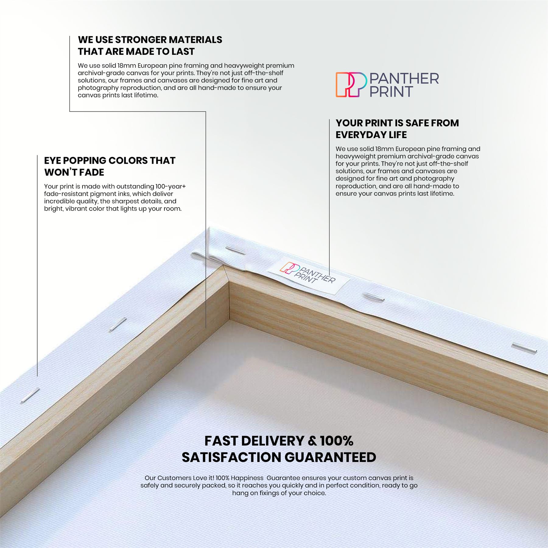 18mm deep, solid pine frames hand built in the UK by master craftsmen.