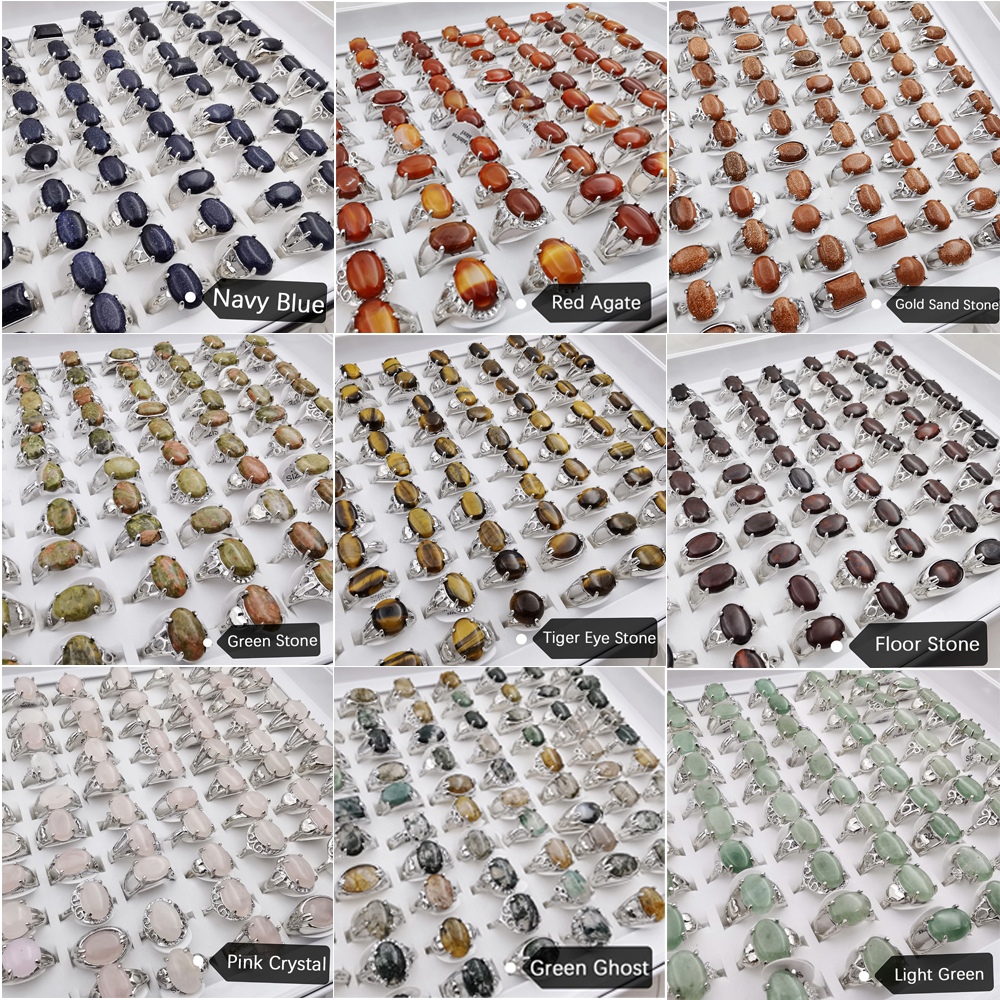 Description : 100% Brand New and High Quality ! Special design and unique structure, a popular item It is a good gift for your lover,family,friend and coworkers Make you charmer and elegant Beautiful and attractive It's a perfect accessory, also a good gift to your friends It will make you beautiful on picture. Suitable for any season. Feature: Material: Alloy Color: Light green,Agate,Pink crystal,Tiger eye stone,Gold sand stone,Green ghost,Green jade,Red agate,Navy blue,Flower green stone,Purple Size:17-21mm Random Department:Women,Men Pattern:As you choose Package Included: 5/15/30/50pcs x Rings(Without Box) Tips: Style randomly send the style you receive may be the same, Please make sure you don't mind before you bid,thanks! Jewelry maintenance: Avoid chemical contact; do not wear when taking a bath; pay attention to collision and scratching; avoid wearing when sweating a lot.