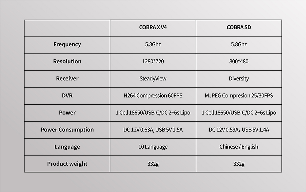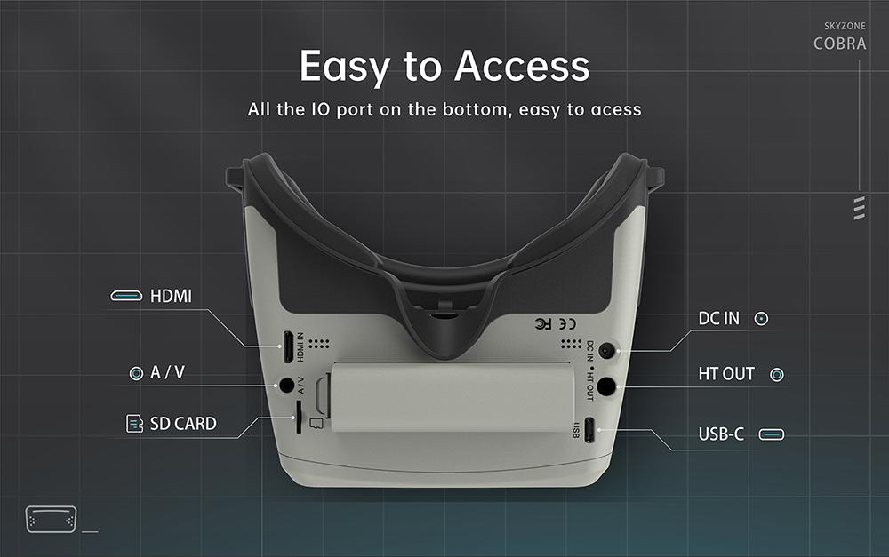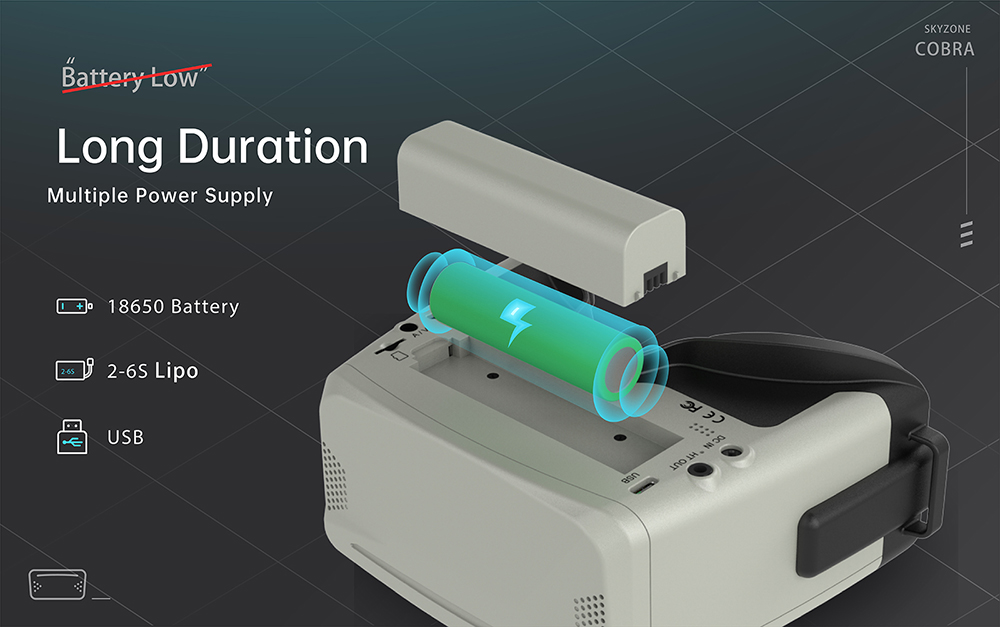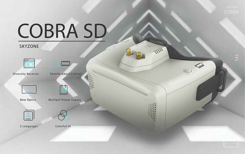 The SKYZONE Cobra is a FPV goggle with LCD screen , the screen have vivid color and high luminance , pilot can see more details in the racing . With RapidMix receiver, the receiver merge two signal to one, avoid image tearing and rolling when signal is weak, make image more stable and clear in challenging condition. The goggle support pilot wear glass while fling. The new OS with several languages to set select, pilot have no trouble with the menu system, with shuttle wheel and new user interface, pilot can set all the setting just by rolling the wheel without taking off the goggle. The goggles can Power by 1 cell 18650 battery or 2~6s lipo battery, the USB charging and DC charging make goggle simple to use in the filed.