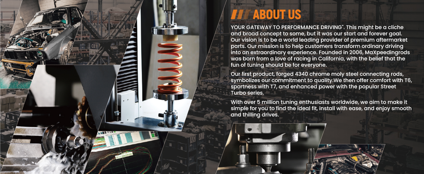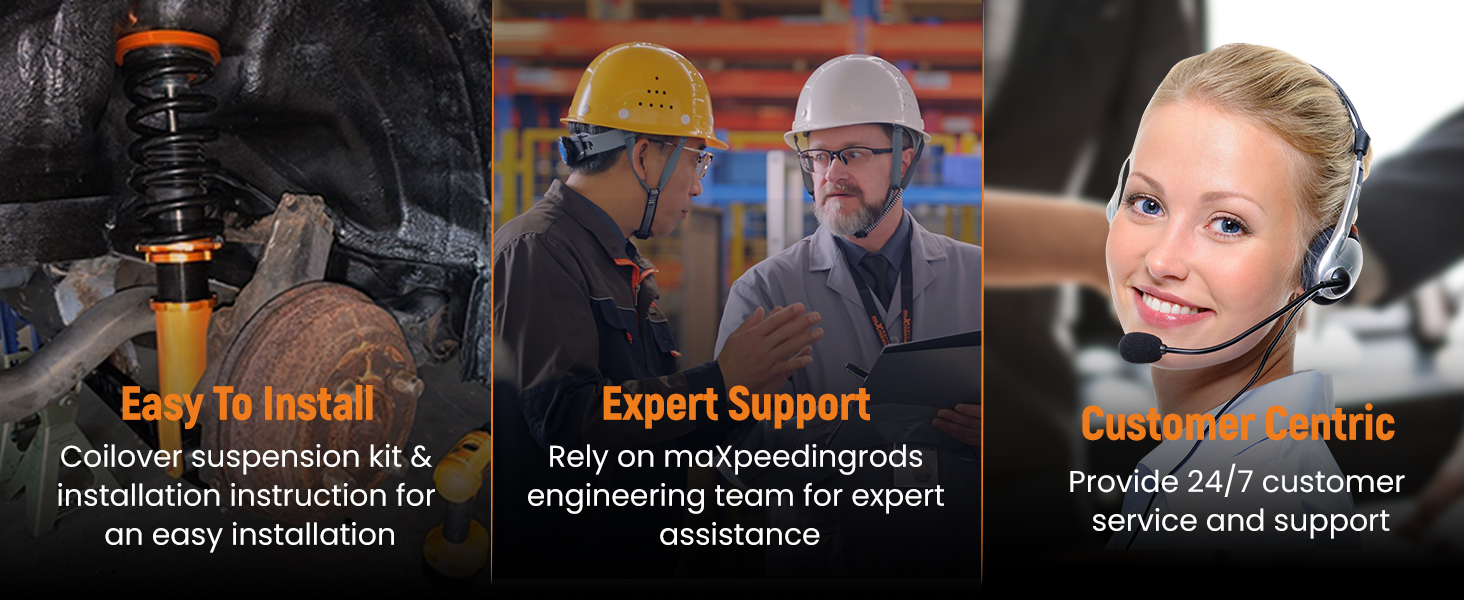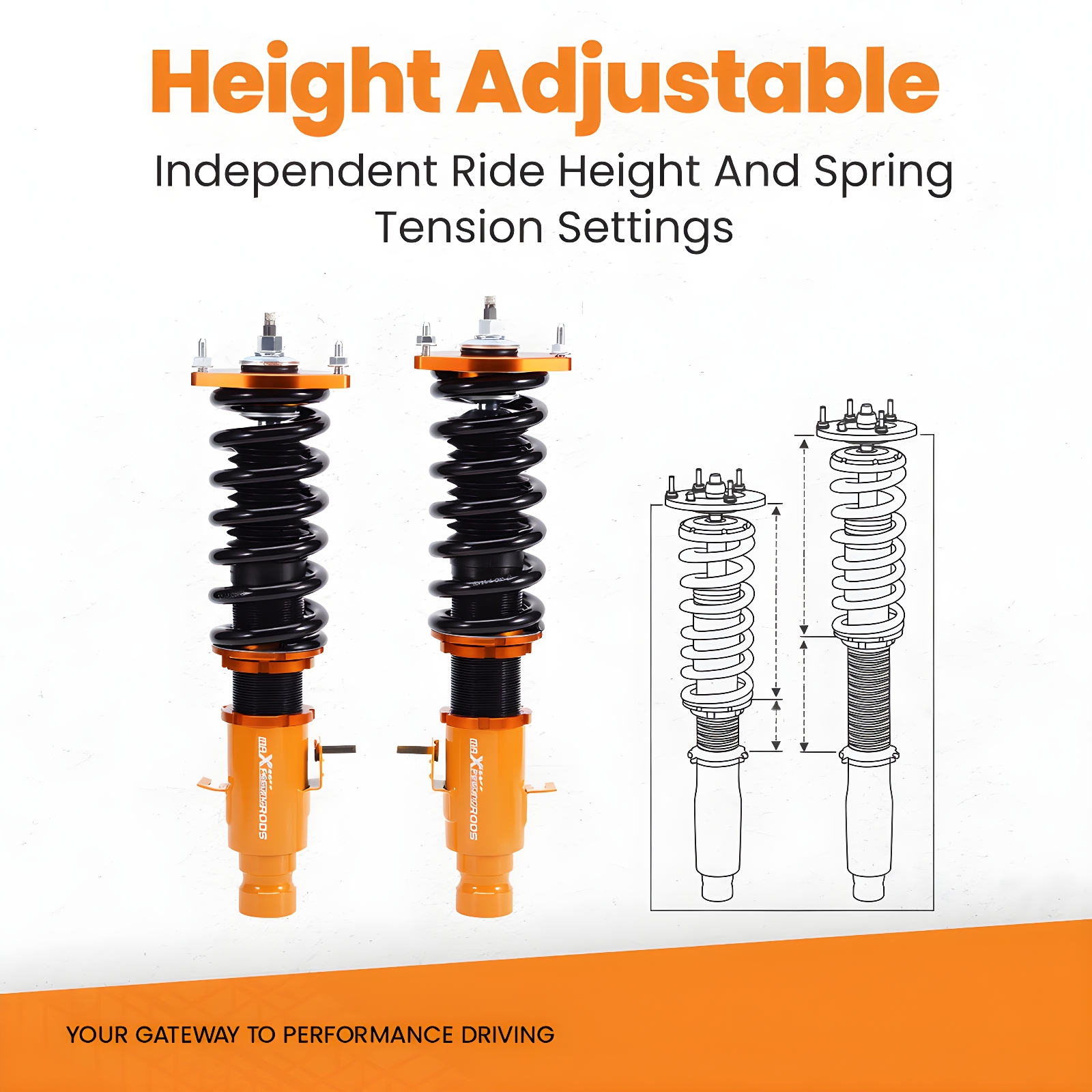- Reinforced Rubber Bushing Upper Mount: Specifically designed for each vehicle, enhances silence and comfort. Adjustable camber angle for certain strut mechanism suspension cars. Full Length Adjustable Type: Allows ride height adjustment without affecting suspension stroke, maintaining comfort while customizing height.