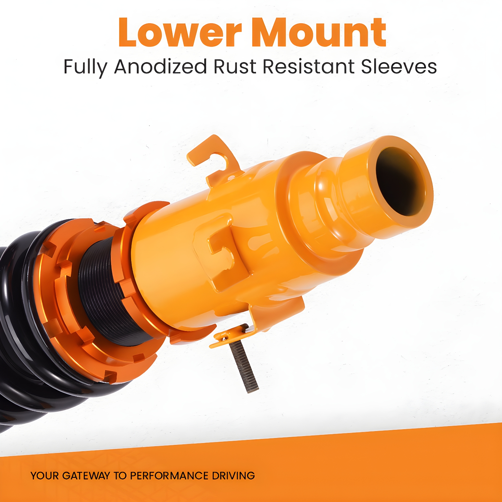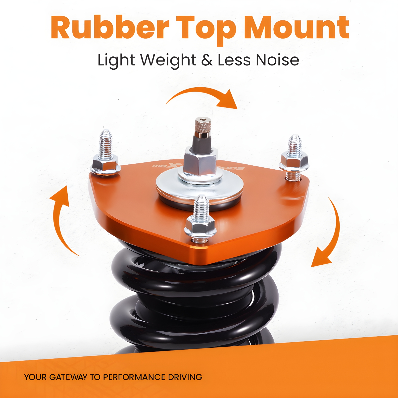 Aluminum Upper Mounts with Hardened Rubber Bushings for Noise Reduction.