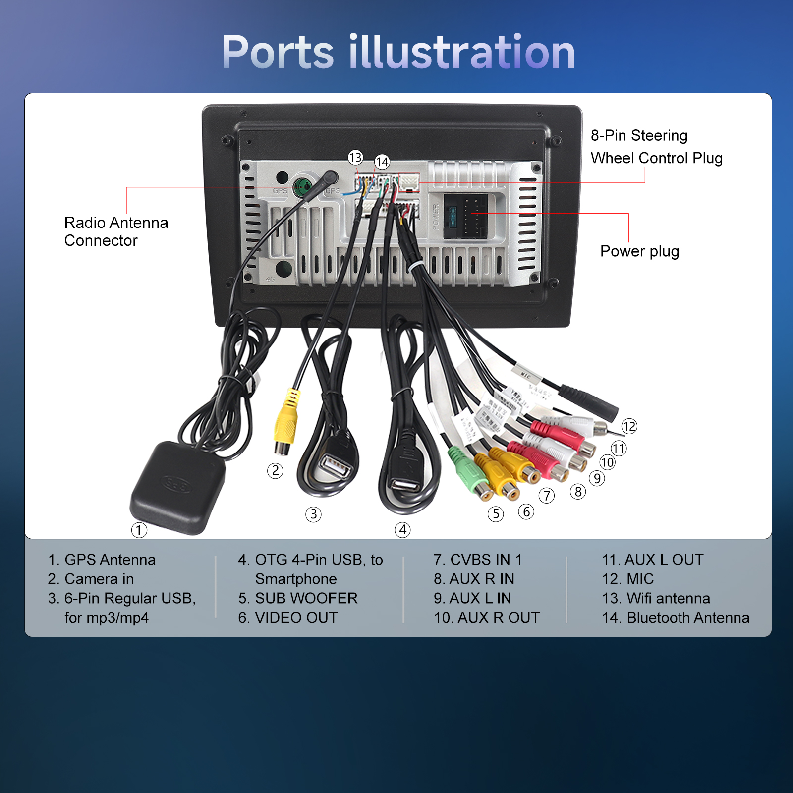 9. Rear USB port input: Support rear cable USB input, can play music/movie