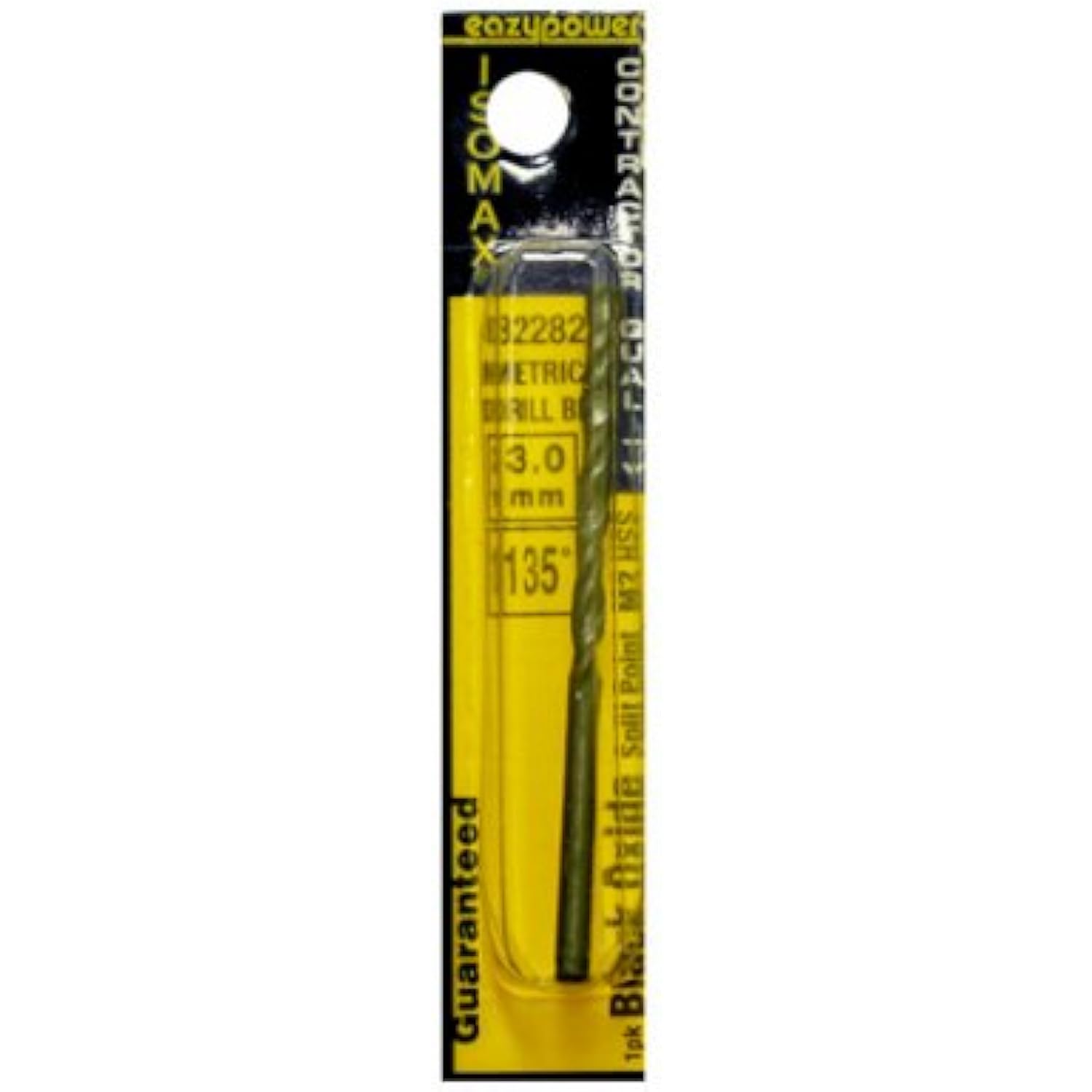 Eazypower black Oxide drill bit is constructed of M2 high speed steel providing extreme durability with black Oxide coating cooling and lubricating bit for longevity. Features a 135 degree split point and jobber length. Product measures 3 mm, 0.1181.