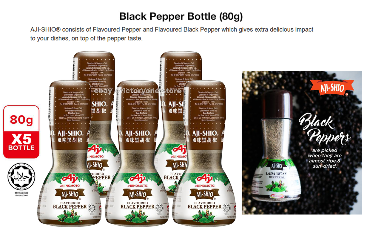 ![]() Condition: New Net Weight : 80g / Each Bottle Quantity : 5 PACKS Product Description: AJI-SHIO® consists of Flavoured Pepper and Flavoured Black Pepper which gives extra delicious impact to your dishes, on top of the pepper taste. AJI-SHIO® Flavoured Pepper is made from the best quality pepper, specially coated with permitted flavouring to give a strong pepper aroma and taste together with the convenience of added flavouring. Packed in a convenient to used dispenser bottle. AJI-SHIO® Flavoured Pepper is perfect for adding the extra spicy pepper aroma and taste to foods like porridge, soup, meat dishes and eggs AJI-SHIO® Flavoured Black Pepper is made from the authentic black pepper, specially coated with selected spices and various seasonings to provide spicy hotness and delicious taste. It is perfect for table topping usage. Just sprinkle onto your favourite food such as fried noodle, seafood and chicken dishes. It will spice up and enhance the flavour and taste of your dishes easily. It is also suitable for marinating of grilled chicken and barbeque seafood. Ingredient Salt, Black Pepper Powder, Maltodextrin and Black Pepper Extract, Contains Monosodium Glutamate, Disodium Inosinate and Disodium Guanylate as permitted flavour enhancers. Food additives from plant origin. SHIPPING COST INCLUDES: -bulk order are welcome - bubble wrap - tracking number - Estimated 15-35 business days via Standard Small Package AIRMAIL Please View All Photos Listing Don't forget check out other great items in my ebay store: victoryonestore Please contact us if you require any information. "What You See Is What You Get" Thank You For Your Support |