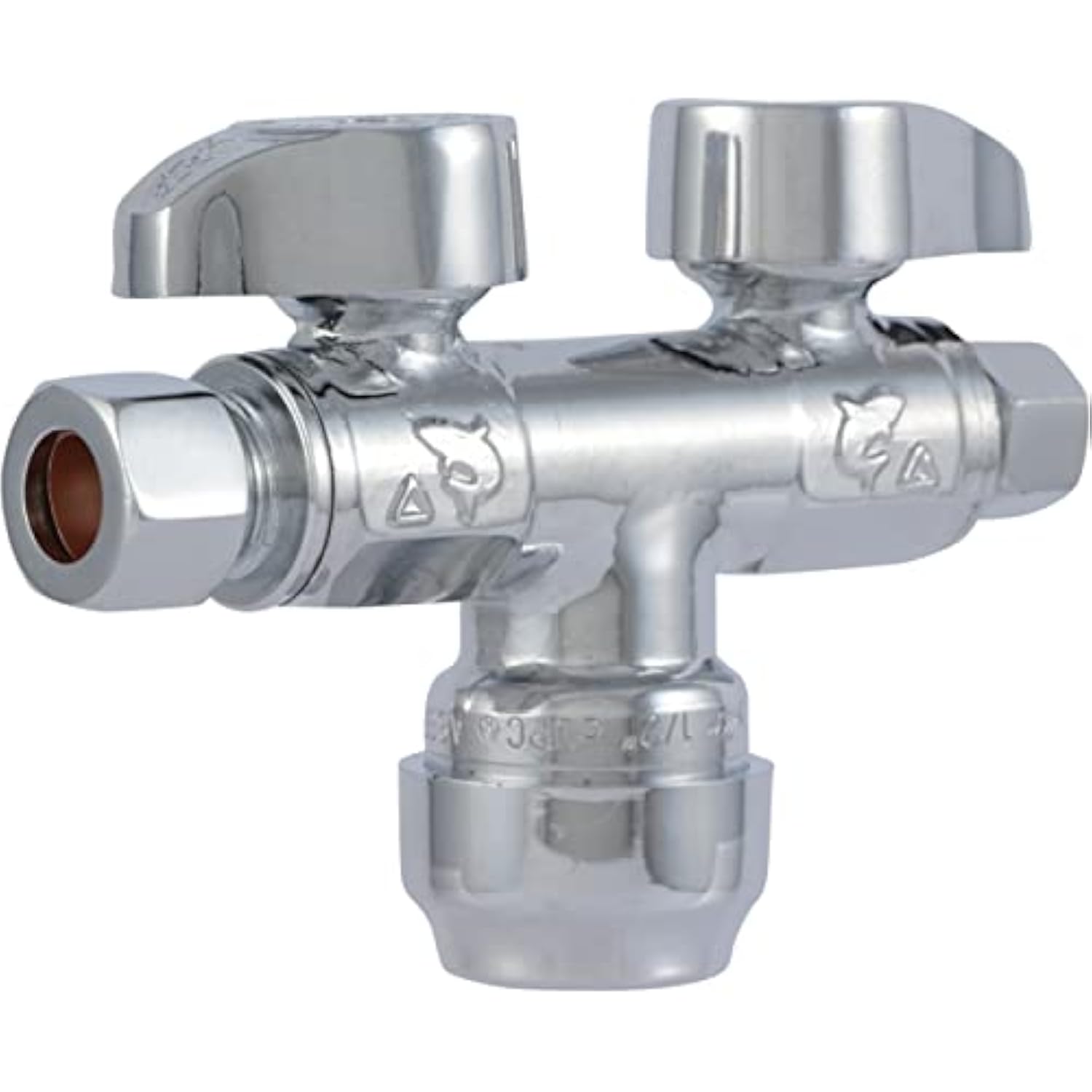 Perfect for use on stub-outs coming out of the wall or through the floor, this dual quarter turn shut off valve is an excellent way to simplify your plumbing needs. Great for independently controlling and shutting off water flow to the fixture for maintenance and repair, this push to connect shut off valve features an innovative design with a 1/2 inch push-to-connect inlet and 1/4 inch compression x 3/8 inch compression outlets which allow for easy installation. No tools, glue, crimping or soldering is necessary for installation, and the water brass valve is ideal for use in tight spaces. The supply stop valve is compatible with any combination of copper, PE-RT, CPVC, and PEX pipes, and is composed of brass with a sleek chrome finish for an attractive aesthetic.