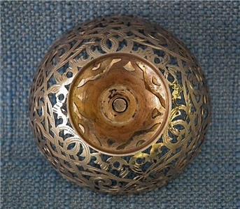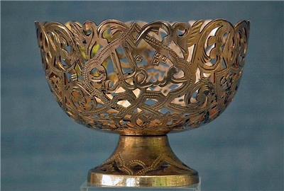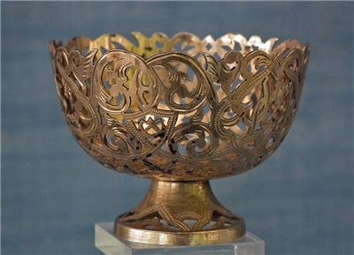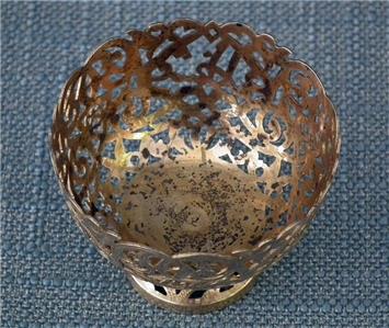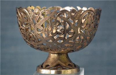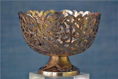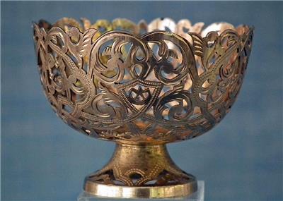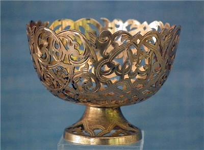 Antique 19th century Turkish Ottoman solid silver gold gilt (unmarked) Islamic coffee cup holder “Zarf” of broad bowl and a low splayed foot, pierced and engraved in the lace form pattern with garlands of foliate motifs, three crescent moons with stars and two scripts in Arabic calligraphy.