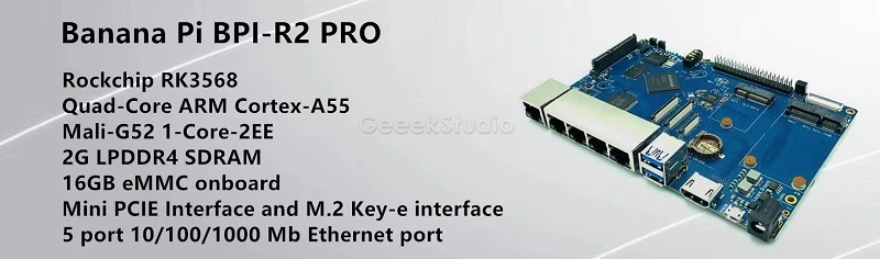 Banana Pi BPI-R2 Pro is the next generation smart router developement board from Banana Pi in 2021. It is powered by Rockchip RK 3568 processor.Onboard 2GB LPDDR4 memory and 16GB eMMC storage, and supports 2 USB 3.0 interface, 5 gigabit network port. M.2 key-E and mini PCIe interface, 2 mipi DSI interface(one can change to LVDS by software), 1 CSI camera interface,1 HDMI output design.