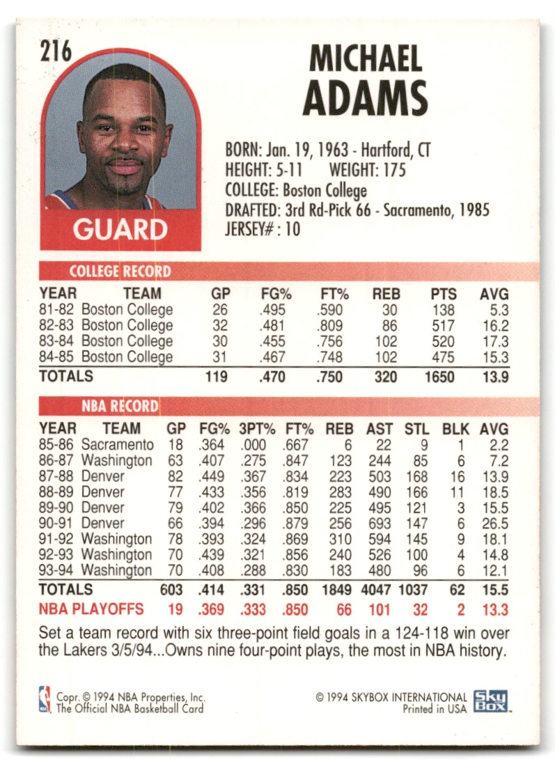 | Description: | Michael Adams | | Category: | Basketball | | Year: | 1994 | | Product: | NBA Hoops Basketball Card | | Team: | Washington Bullets | | Card Number: | 216 | | Dimensions: | 3½" x 2½" | | SKU: | BK B0001 R01 L (71) |