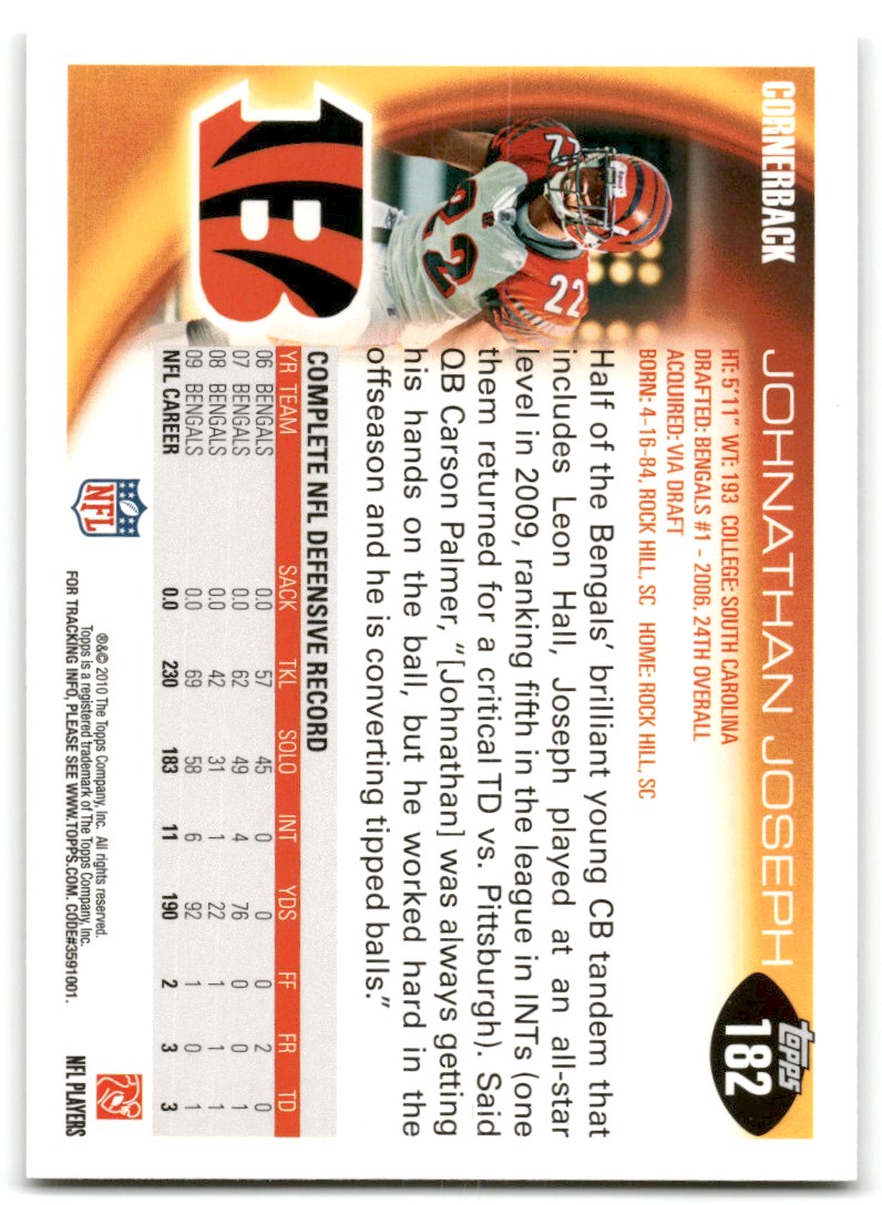 | 2010 Topps Football Card Johnathan Joseph #182 Cincinnati Bengals |
