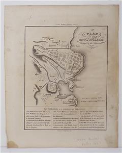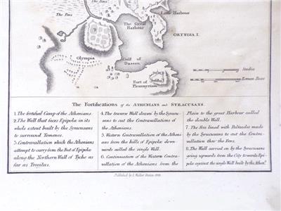 Plan of the City of Syracuse Besieged by the Athenians, pulled from an edition of Rollins History published by S. Walker, Boston, in 1823. 8 5/8" by 10 7/8".Very good condition. Very slight soiling. Edges rough, with stain lower left that comes nowhere near the image.