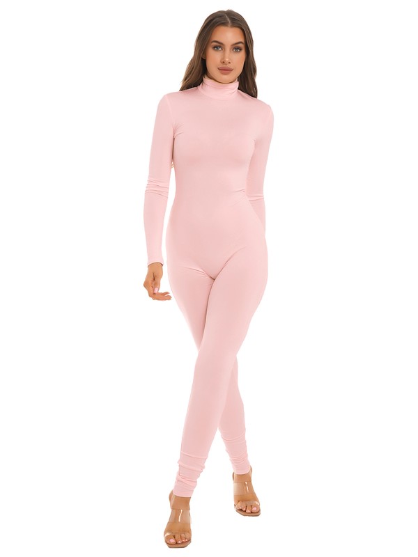 Women Solid Color High Collar Long Sleeves Stretchy Long Jumpsuit Bodysuit.