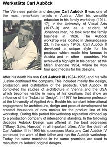 Der Wiener Maler und Designer Carl Auböck II zählt zu den bemerkenswertesten Künstlerpersönlichkeiten Österreichs. Nach einer vielseitigen Ausbildung (1914-17 Lehre als Bronzearbeiter und Ziseleur im elterlichen Betrieb, 1917-19 Studium an der Akademie der Bildenden Künste in Wien, 1919-21 Schüler von Johannes Itten am Bauhaus in Weimar) übernahm er 1926 die väterliche Werkstatt in Wien VII, Bernardgasse 23. Anfang der 40er Jahre entwickelte Auböck jenen unverkennbaren Stil für Gebrauchs-gegenstände gehobenener Wohnkultur, der ihn nach Ende des Krieges im In- und Ausland berühmt machte. Den Höhepunkt bildete die Mailänder Triennale 1954, auf der Auböck vier Goldmedaillen für sein Werk erhielt.