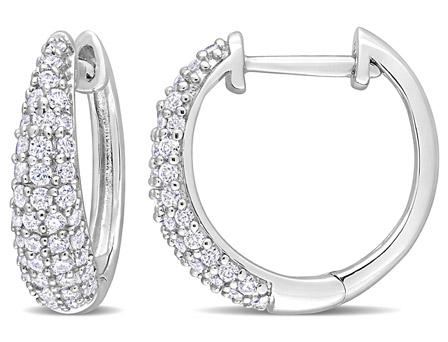 Glam up your everyday look with these multi-row hoop earrings. Crafted in luminous sterling silver, these exceptional earrings feature 78 round-cut, pave-set created white moissanite gemstones arranged in a clustered multi-row graduated hoop design. Enhanced with a polished finish, these exquisite earrings are secured with clip-in closures. Coordinate with a matching pendant for a flawless look.