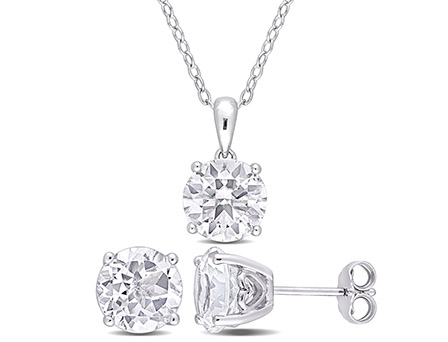 Dazzle the onlookers with these sparkling solitaire pendant with chain and earrings. Crafted in lustrous sterling silver, this glamorous two-piece set features three round-cut, 4 prong-set, white topaz (8x8mm) gemstones in a classic heart design detail on earrings and pendant setting. Enhanced with a polished finish, the exquisite pendant is suspended on an 18-inch round cable chain secured with a spring-ring clasp, and the matching basic solitaire earrings are secured with butterfly closures. A perfect way to style casual evening looks.