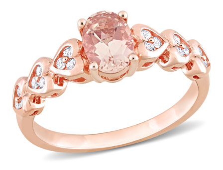 Sweetly romantic, this ring is destined to be adored. An oval-cut morganite radiates soft peachy-pink hues at the center. Round-cut diamonds twinkle in heart-shaped settings along the band, which is crafted in dreamy 10K rose gold.