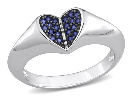 Go for a simple yet sophisticated look with this unique heart ring. Crafted in lustrous black rhodium plated sterling silver, this flattering ring showcases 20 round, pave-set created blue sapphire gemstones clustered into a heart shape sinking into the ring band. Polished with a brilliant finish, this fashion-forward ring is ideal for a minimalistic fashion aesthetic.